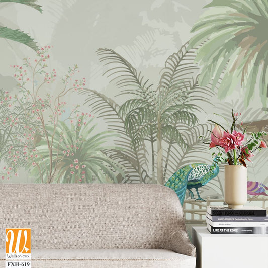 Mughal Garden Illustration for wall Mural, Watercolor Background, Peacock. [WP-FXH-780]