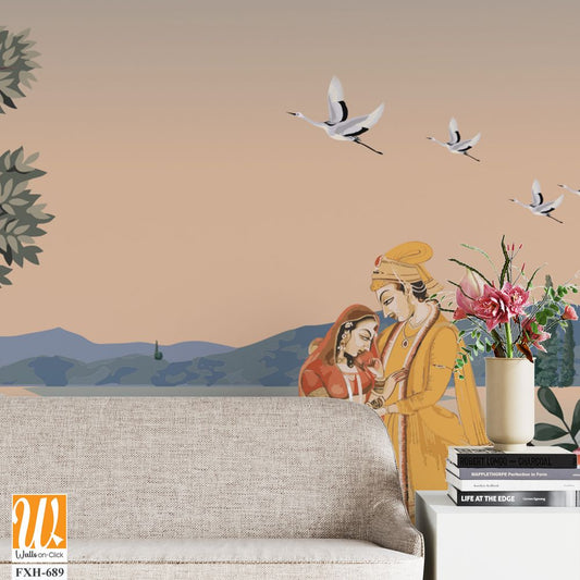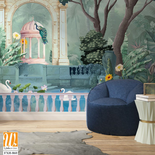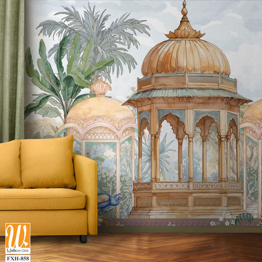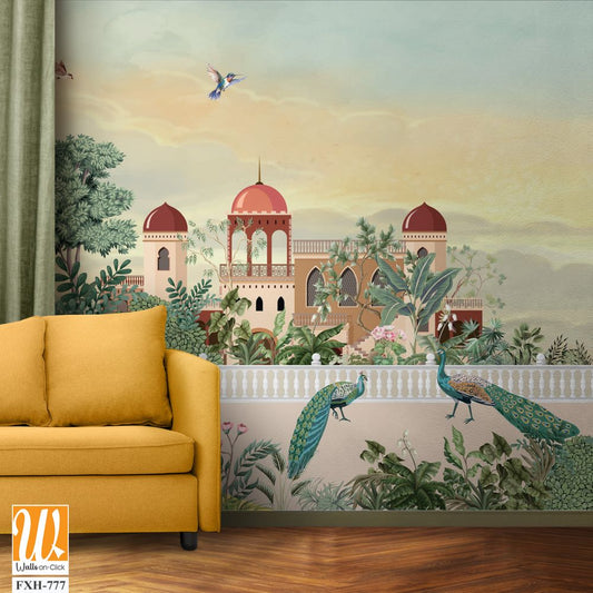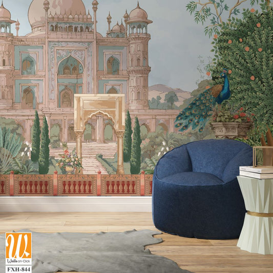 Mughal garden pavilion, temple, peacock, parrot, flower, tree illustration for wallpaper [WP-FXH-858]
