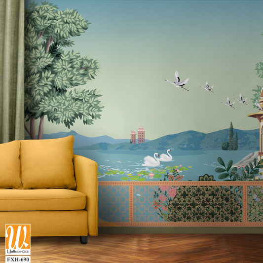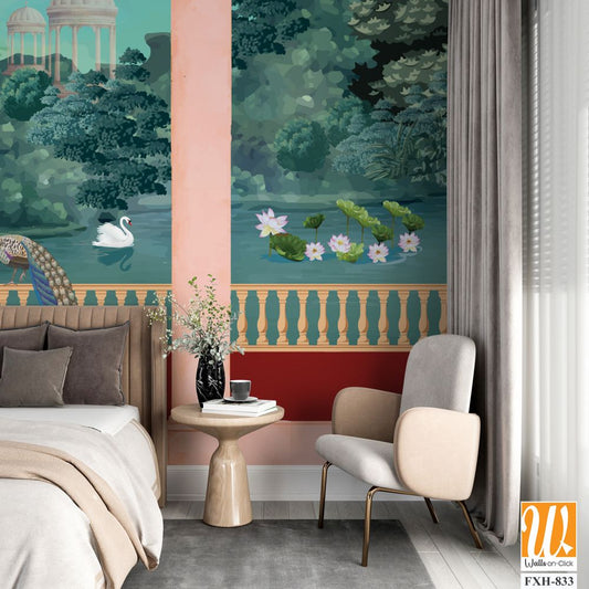 Mughal garden arch, dome illustration for wallpaper. Botanical tree landscape illustration. Water lily and swan in a beautiful lake. [WP-FXH-690]