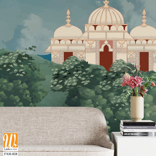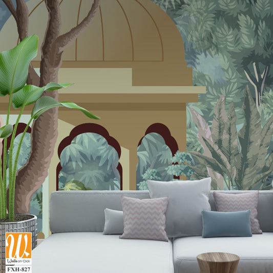 Mughal forest garden with Dome, Birds, plant and botanical tree landscape illustration pattern, Mughal Wall Mural. [WP-FXH-827]