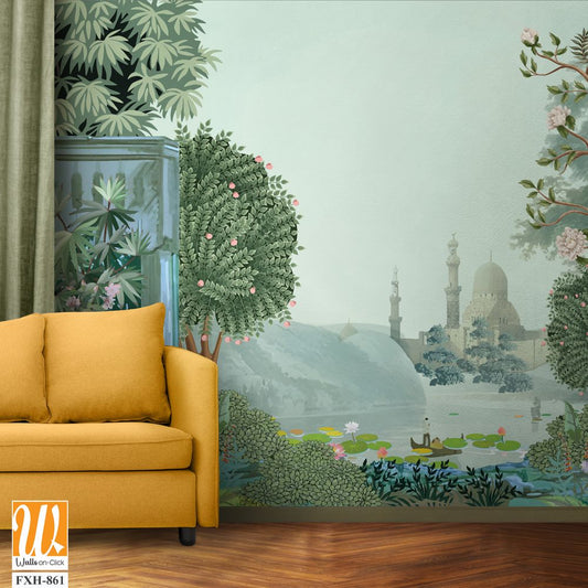 Mughal forest garden with temples, lake, hill, plant and botanical tree landscape illustration pattern, Mughal Wall Mural. [WP-FXH-828]