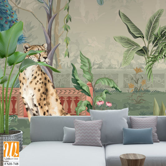 Mughal garden with cheetah, peacock, temple, tree, flower seamless pattern illustration [WP-FXH-748]