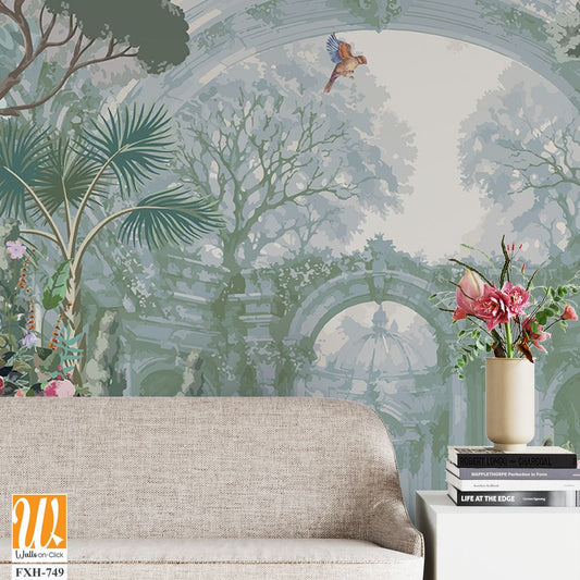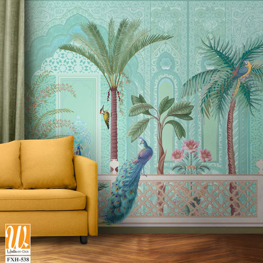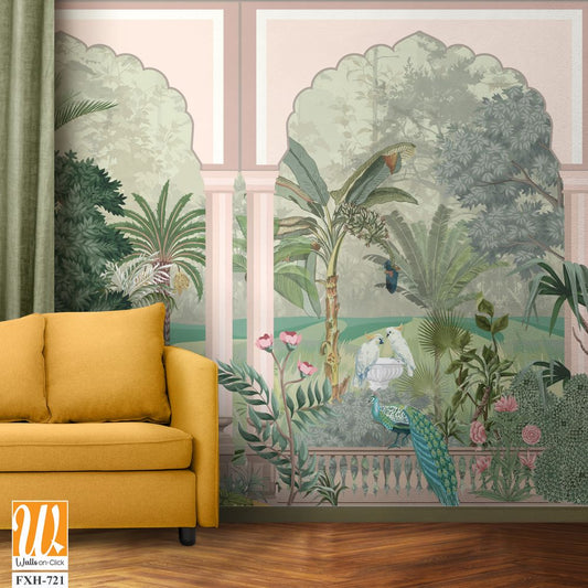 Jungle wallpaper, Palazzo wallpaper, Mughal wall paper, Birds, Tree, Watercolor background. [WP-FXH-834]