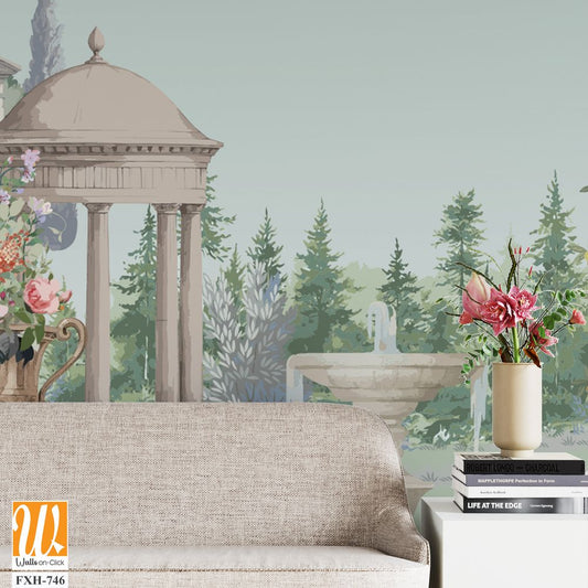 Greek, Roman, Greek arch with river, garden, peacock, sawn, wallpaper Illustrations. Roman architecture, landscape illustration for wallpaper. [WP-FXH-814]