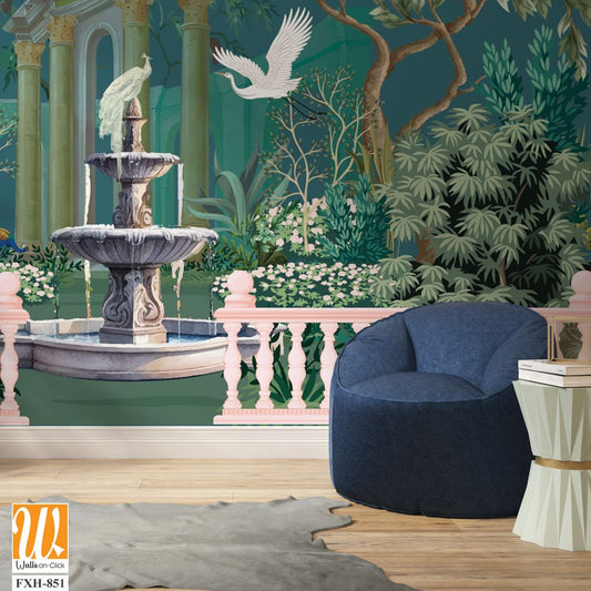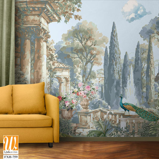 Italian garden with peacock, bird, tree vintage illustration for wallpaper [WP-FXH-759]