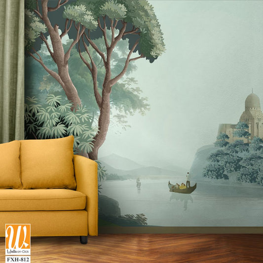 Antique scenic landscape wallpaper. Lake, Mural in the hills Vintage landscape wallpaper. [WP-FXH-812]