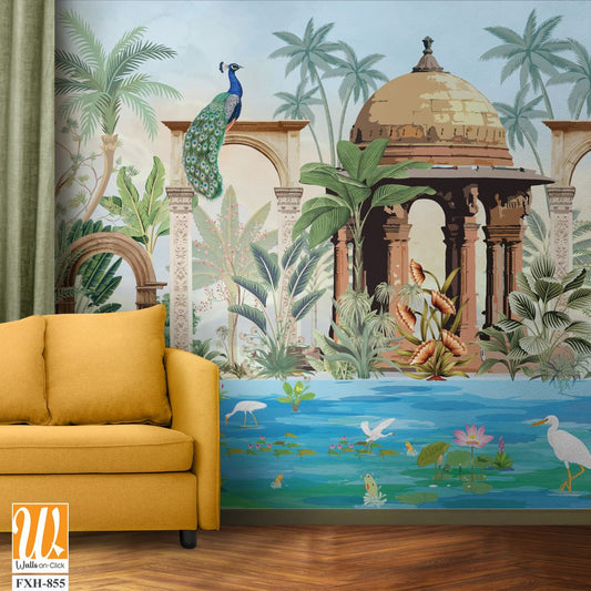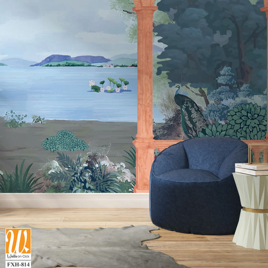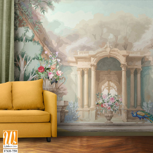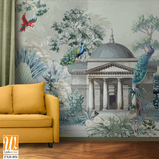 Greek ancient architecture, bird, botanical, peacock, landscape illustration for wallpaper [WP-FXH-839]
