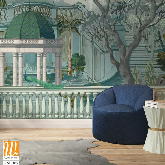 Greek garden with peacock, temple, dome, stair illustration for wallpaper [WP-FXH-746]