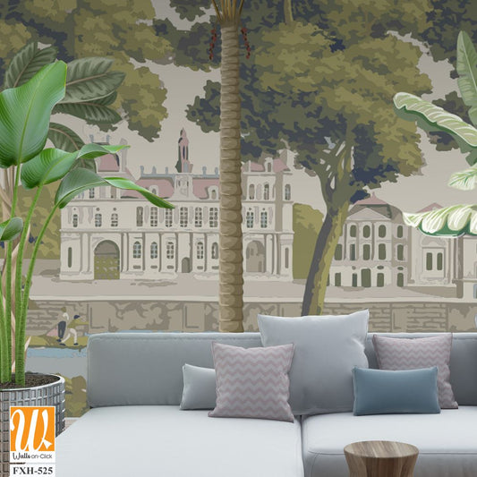 Baroque style garden with peacock, palace, dome, arch illustration for wallpaper [WP-FXH-749]