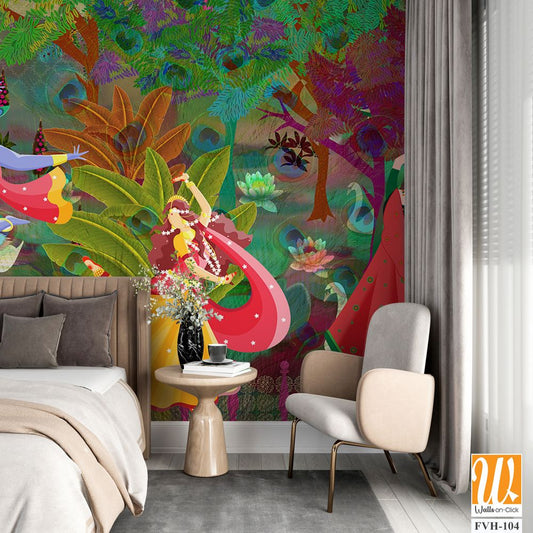 Indian woman around vibrant floral motifs Wallpaper [WP-FXD-155]