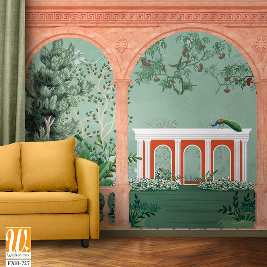Ancient greek garden wallpaper.Greek, Roman, Greek arch, garden, peacock, wallpaper Illustrations. Roman architecture dome, fountain, parrot landscape illustration for wallpaper. [WP-FXH-727]
