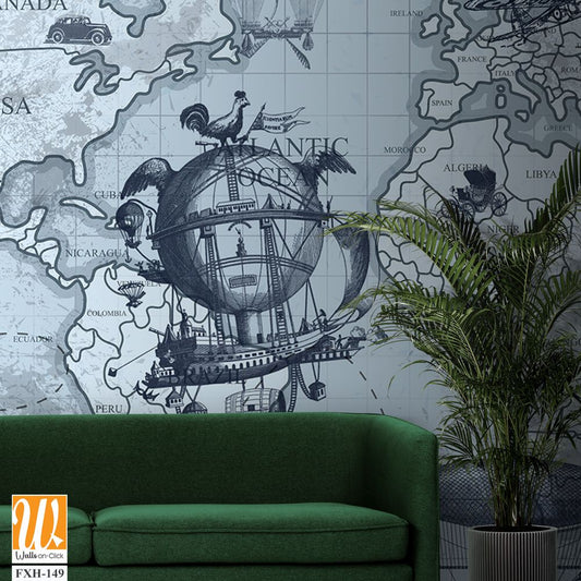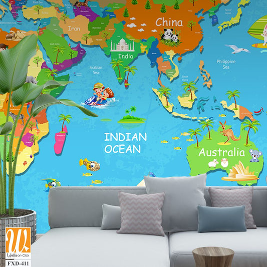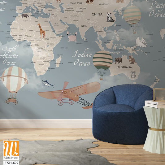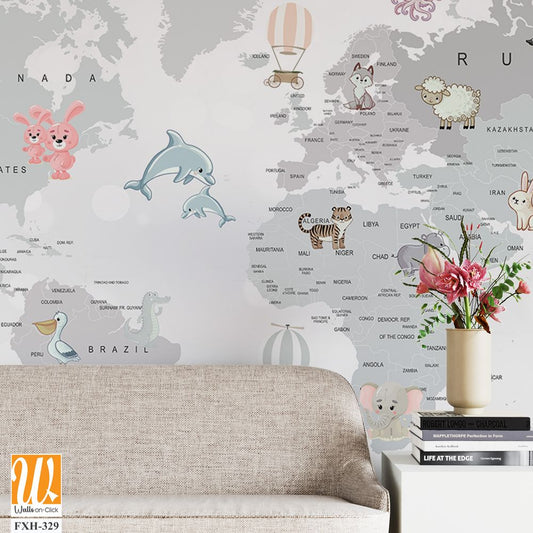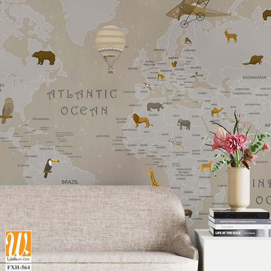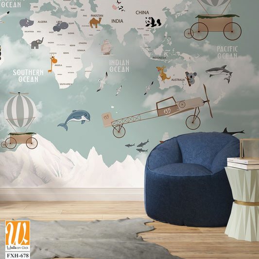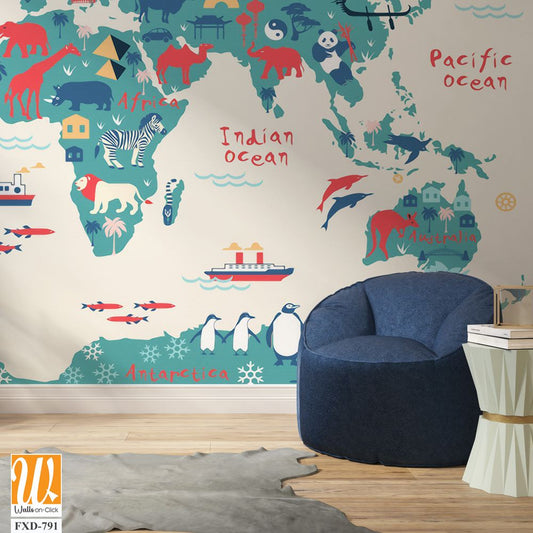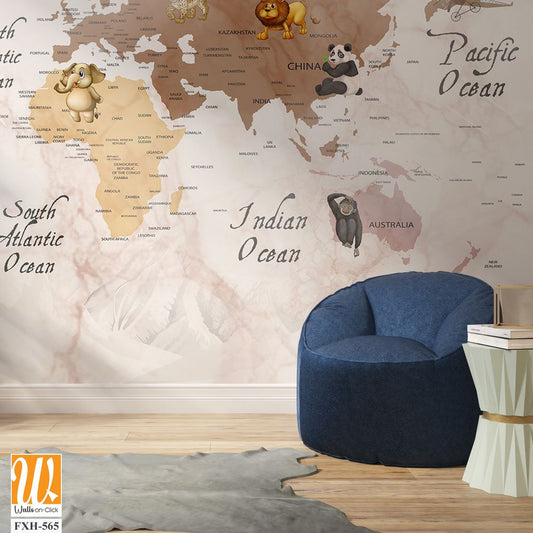 Kids world map, Animals world map, Educational world map wallpaper design for children's rooms [WP-FXH-678]