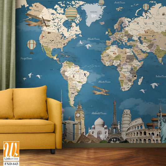 World map with famous landmarks and artwork Wallpaper [WP-FXD-643]