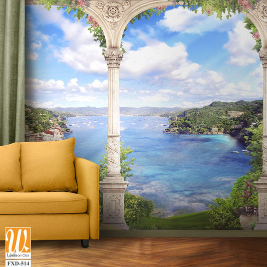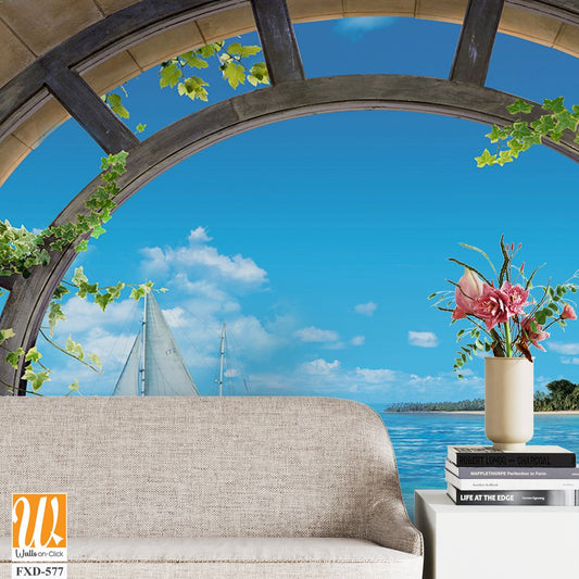 Arched stone arch with a view of the sea and sailboats Wallpaper [WP-FXD-577]