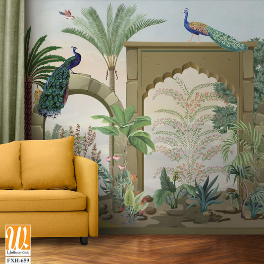 Mughal forest garden with peacock, parrot, plant and botanical tree landscape illustration pattern [WP-FXH-668]