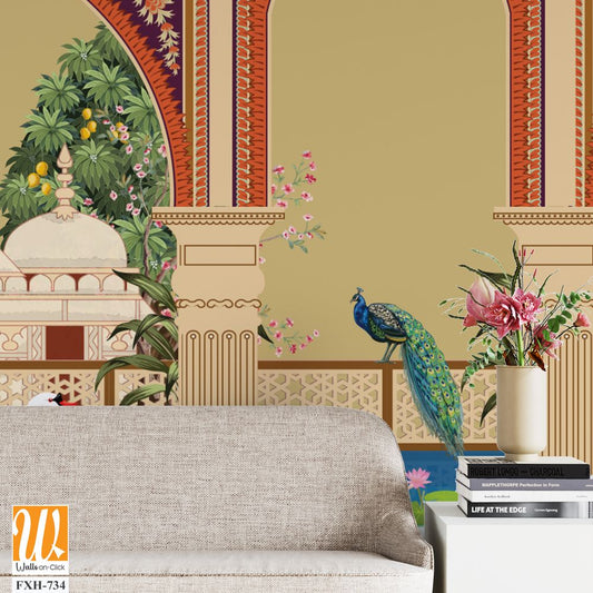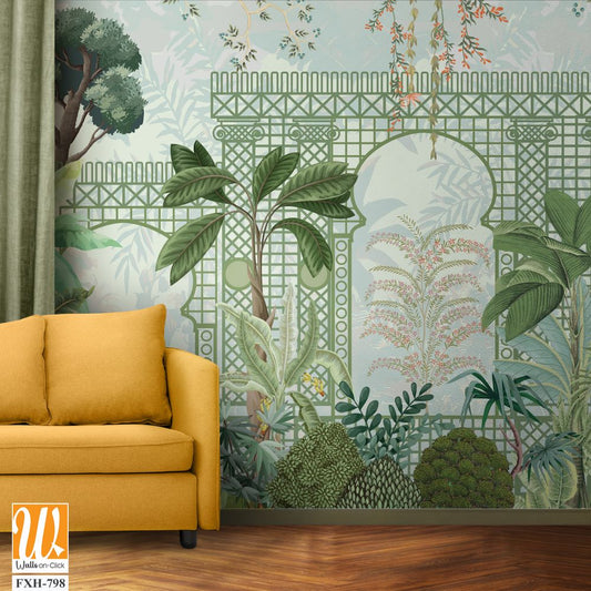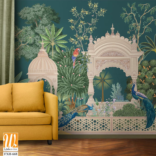 Mughal garden with plants tree palace illustration pattern for wallpaper, Mughal Mural background Design, Watercolor, Tropical Plant. [WP-FXH-798]