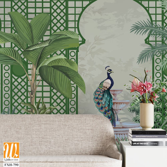 Decorative Wall Mural Design, Lattice Wall Design, Garden Wall Mural Design, Peacock, Tropical Plants. [WP-FXH-790]