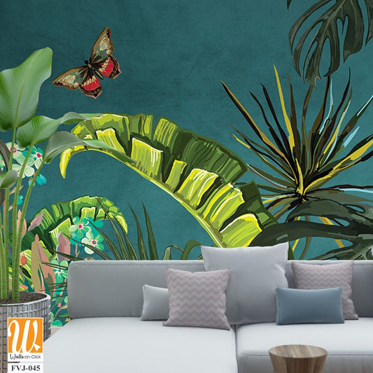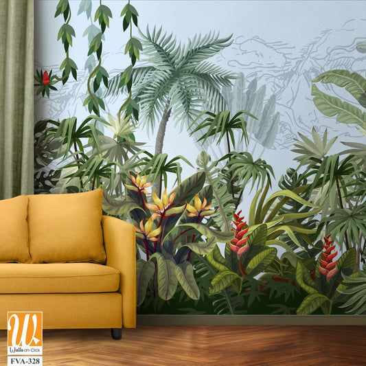 African Wild Life Mural Design for wall Painting, Tropical Wall Mural, Tropical Plam trees, Birds, Vintage waal Murals. [WP-FXH-794]