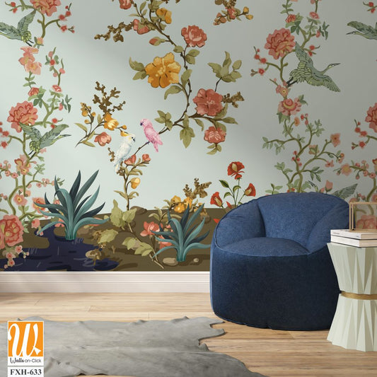 3d wallpaper design with branches, birds and flowers for digital wall print [WP-FXH-633]