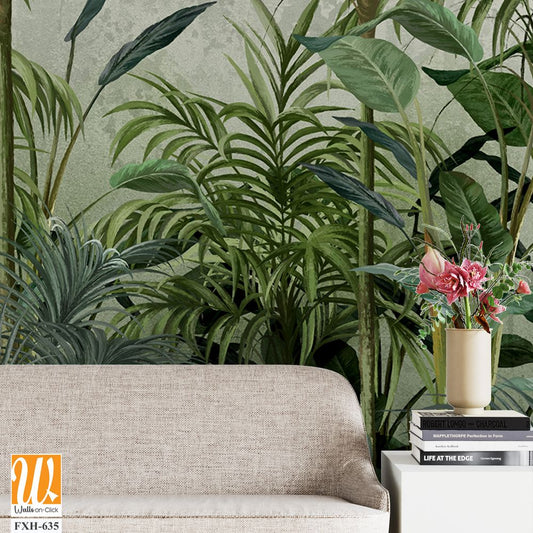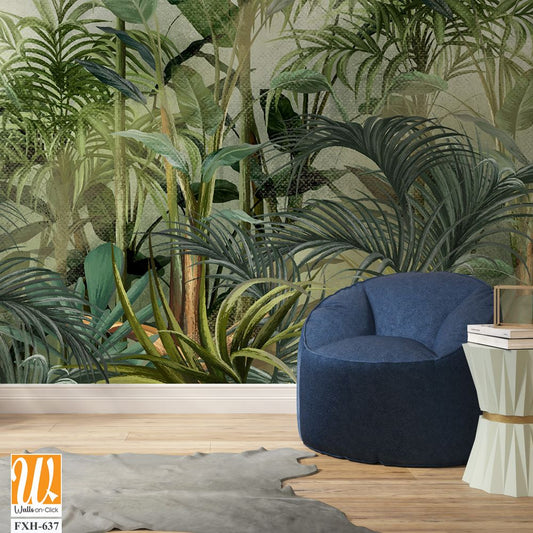 Ainted plants, tropical plants and trees, art drawings on a textured background, photo wallpapers for the interior come to life on canvas. [WP-FXH-635]