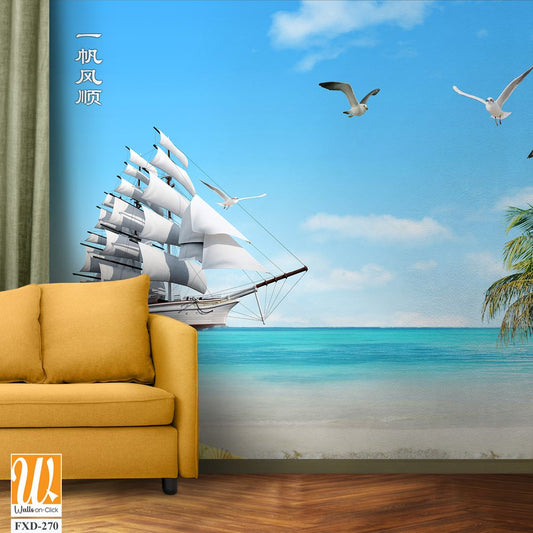 3D wallpaper of a ship and white beach with palm trees [WP-FXD-270]