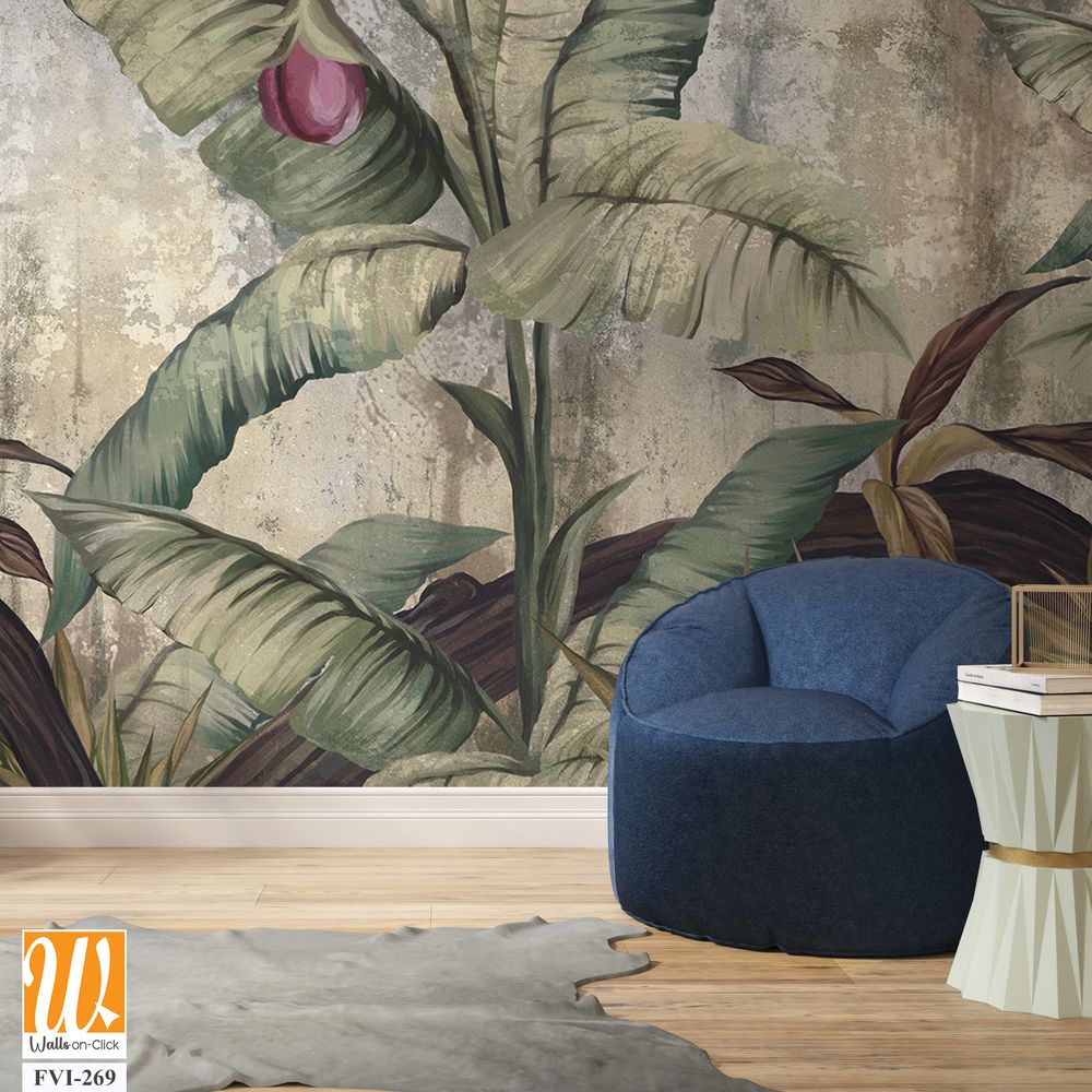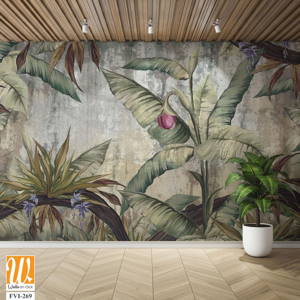 A textured shabby background that depicts the tropics, which depicts leaves, branches, ferns, large branches, winds [WP-FVI-269]