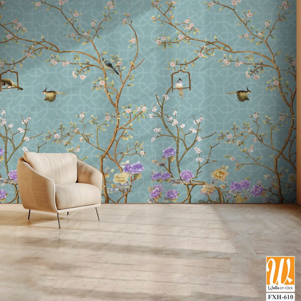 3d wallpaper design with branches, birds and flowers for digital wall print [WP-FXH-633]