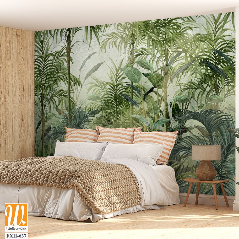 A whole world created by the artists brush, which combines fiction and colorful reality. Bright green tropic, art pattern on a textured background, photo wallpaper for the interior. [WP-FXH-637]