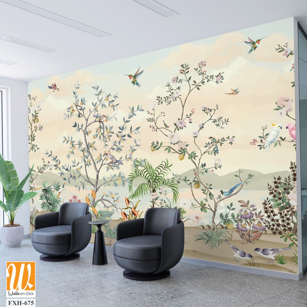 Scalamandre Blossom Chinoiserie Mural Wallpaper, Watercolor background, Wallpaper, Birds. [WP-FXH-675]
